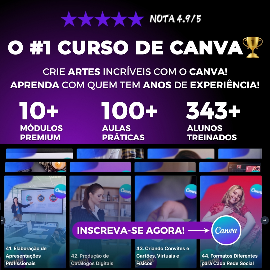 O Curso Canva Pro Mastery é um programa de treinamento completo e avançado, projetado para capacitar você a dominar todas as ferramentas e funcionalidades do CANVA, tanto no mobile quanto no desktop. Este curso foi criado pela nossa própria equipe, mestres no assunto, para transformar qualquer pessoa, independentemente do seu nível de experiência, em um especialista em design gráfico utilizando somente o Canva. Com mais de 100 vídeo aulas e mais de 10 módulos, fora os módulos bônus, o curso abrange desde os conceitos mais básicos até as técnicas mais avançadas de design.